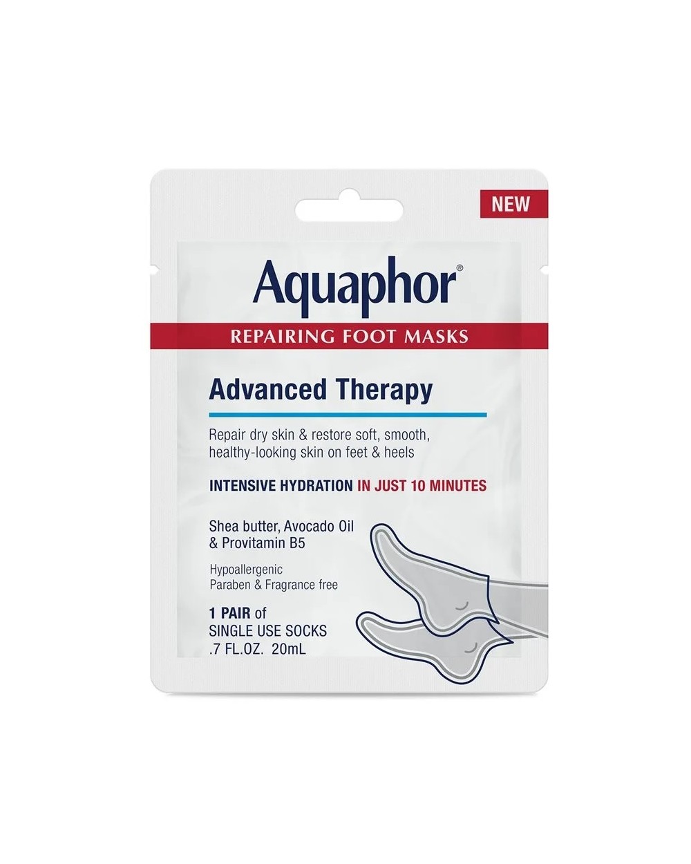 Infused with a blend of avocado oil and shea butter, the hydrating and conditioning foot moisturizer socks also contain Aquaphor's signature ingredients: Provitamin B5, Glycerin and Bisabolol. For the ultimate feet care, add this foot moisturizer for dry feet to your personal care routine to enjoy soft, healthy-looking feet and heels. These foot masks also make a great addition to your pedicure supplies so you can enjoy a foot spa treatment from the comfort of your home. Simply apply the foot masks to clean, dry feet for 10 minutes. After removing the feet mask socks, rub the excess product into your feet—there is no need to rinse your feet after use. Each of the ingredients in Aquaphor skin care products are tested and approved for their quality and safety, and suitability for dry, sensitive skin.