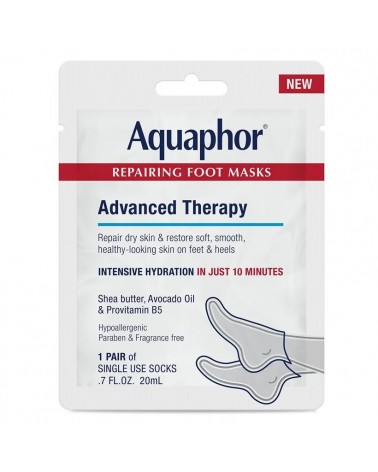Aquaphor Repairing Foot Masks are a hydrating foot care treatment that delivers intense hydration to dry feet in just 10 minutes. These moisturizing foot masks are easy to use and mess free for a convenient self care treatment at home or while traveling. The repairing foot masks are fragrance free and make a great dry feet treatment to restore soft, smooth and healthy-looking skin on your feet and heels. The gentle, moisturizing foot mask formula helps revitalize, relieve and replenish dry feet, so you can look and feel your best.