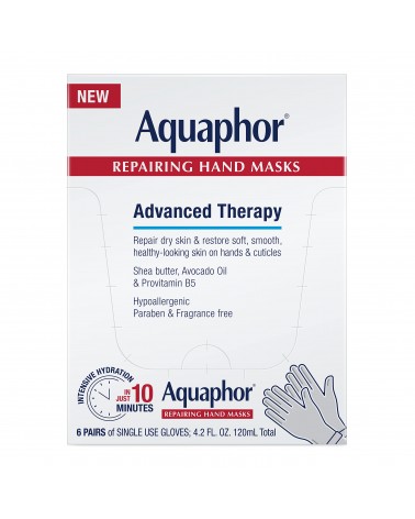 Aquaphor® Repairing Hand Masks deliver intensive hydration to dry hands in just 10 minutes. These moisturizing gloves are easy to use and mess free for a convenient self care treatment at home or while traveling. The repairing hand masks are also fragrance free and help restore soft, smooth and healthy-looking skin on hands and cuticles. Designed to repair dry skin, the hand moisturizer gloves offer a gentle formula to help revitalize, relieve and replenish dry hands, so you can look and feel your best.