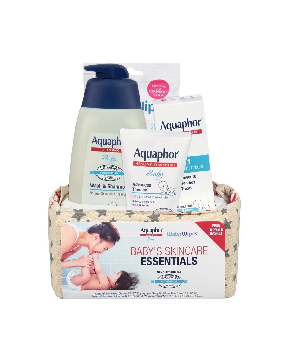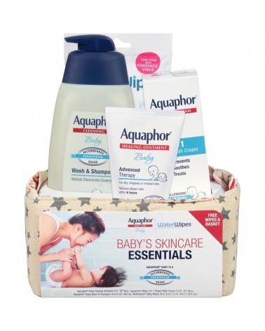 NEW and improved Aquaphor® Baby Skincare Essentials Gift Set with added value FREE WaterWipes® in an adorable basket. All of our products are hypoallergenic and free of fragrances, parabens, and dyes. Give your baby gentle care from cheek to cheek!