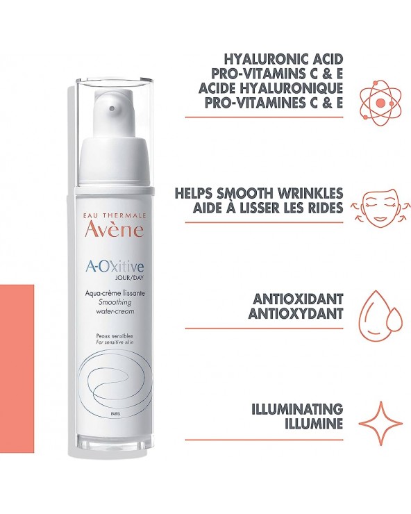 Avène A-Oxitive Smoothing Water-Cream helps protect the skin and fight aging signs while hydrating, illuminating, and plumping the skin.