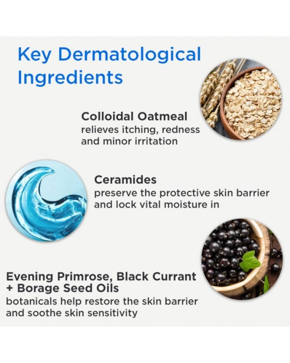 Aqua (Water), Caprylic/Capric Triglyceride, Glycerin, Polysorbate 60, Cetearyl Alcohol, Cetyl Alcohol, Stearyl Alcohol, Euphorbia Cerifera (Candelilla) Cera, Butyrospermum Parkii (Shea) Butter, Squalene, Colloidal Oatmeal, Ceraamide NP, Ceramide NS, Ceramide EOS, Ceramide EOP, Caprooyl Sphingosine, Caprooyl Phtyospingosine, Cholesterol, Ribes Nigrum (Black Currant) Seed Oil, Oenothera Biennis (Evening Primrose) Oil, Borago Officinalis (Borage) Seed Oil, Linum Usitatissimum (Flax) Seed Oil, Sodium Hyaluronate, Tocopherol (Vitamin E), Ascorbyl Palmitate, Tocopherol Acetate, Ethylhexylglycerin, Sodium Chloride, Ceteareth-25, Behenic Acid, Sorbitan Stearate, Carbomer, Sodium Hydroxide, Phenoxyethanol