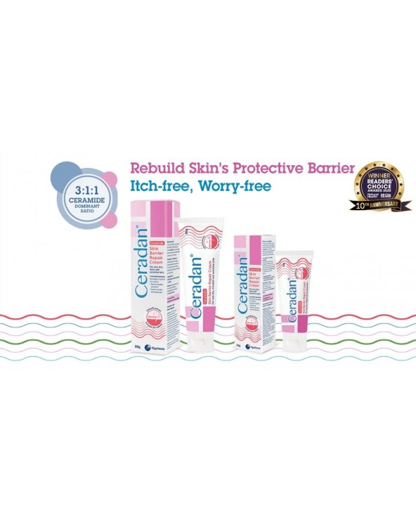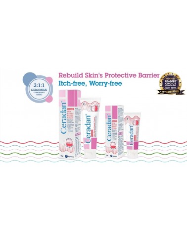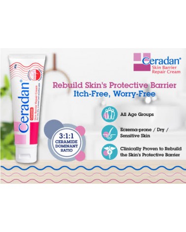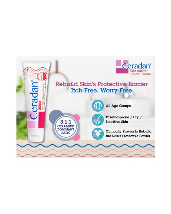 Ceradan® Skin Barrier Repair Cream is a scientifically formulated ceramide-dominant moisturiser in 3:1:1 ratio of essential skin lipids (ceramide, cholesterol, free fatty acids). It is clinically proven to rebuild the skin’s protective barrier, reduce symptoms and the incidence of flares. Suitable for eczema-prone skin, dry and sensitive skin.