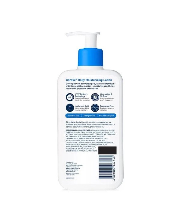 CeraVe Daily Moisturizing Lotion is a lightweight, oil-free moisturizer that helps hydrate the skin and restore its natural barrier. Formulated with 3 essential ceramides that work together to lock in skins moisture and help restore your skin’s protective barrier. MVE technology encapsulates ceramides to ensure efficient delivery within the skin’s barrier and slow release over time. Supporting your protective skin barrier, long after you’ve finish applying. Our daily moisturizer leaves the skin feeling comfortable and is gentle on the skin as it provides 24-hour hydration.