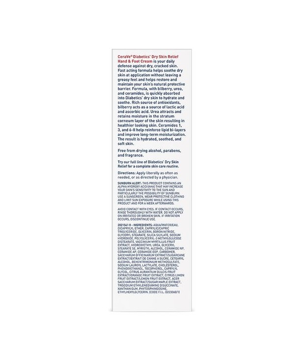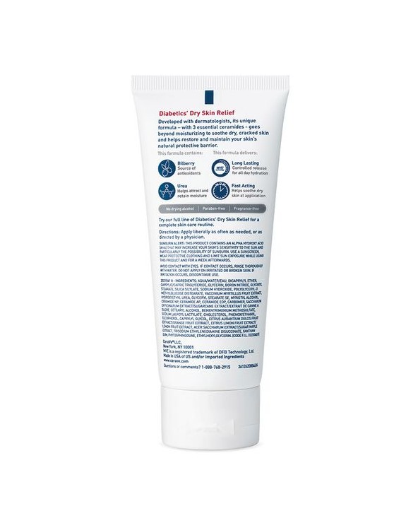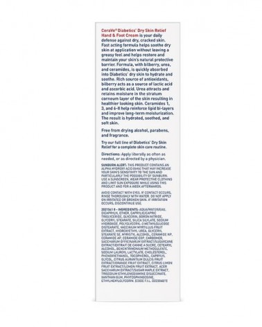 CeraVe Diabetics' Dry Skin Relief Hand and Foot Cream was developed with dermatologists to provide soothing, 48-hour hydration for diabetics’ dry skin. Our fragrance- and paraben-free moisturizer is formulated with urea, bilberry and 3 essential ceramides that work together to lock in skins moisture and help restore your skin’s protective barrier. Patented with MVE technology to encapsulate ceramides to ensure efficient delivery within the skin’s barrier and slow release over time. Supporting your protective skin barrier, long after you’ve finish applying. 95% of diabetic testers said their skin felt immediately smoother.