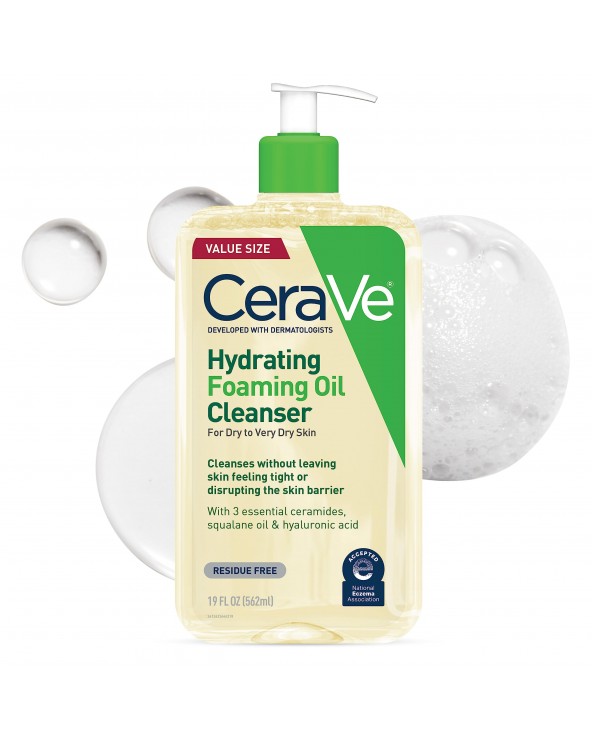 Developed with dermatologists, CeraVe Hydrating Foaming Oil Cleanser transforms from an oil into a soft lathering foam. It gently yet effectively cleanses the skin’s surface and removes excess oil without leaving your skin feeling tight or dry. This oil cleanser with three essential ceramides helps to lock in moisture and helps maintain the skin’s protective barrier. It also features beneficial ingredients for healthy-looking skin, such as squalane oil, triglyceride, and hyaluronic acid.