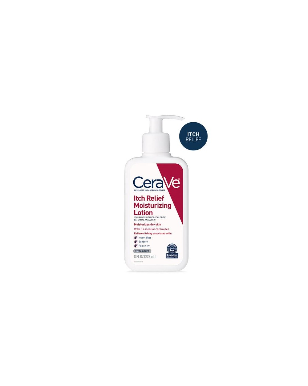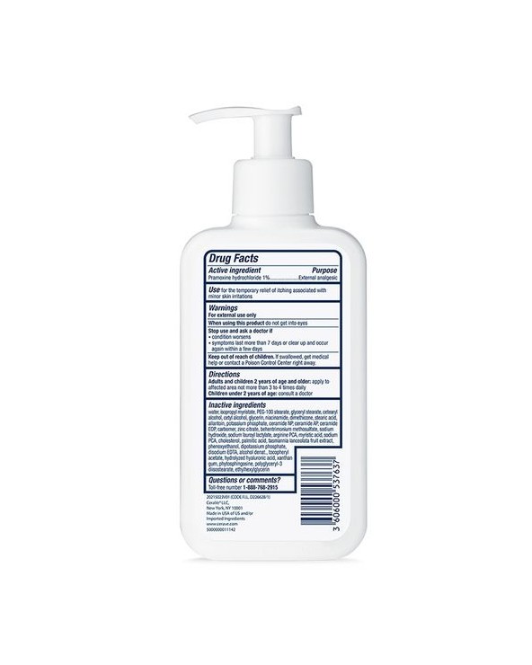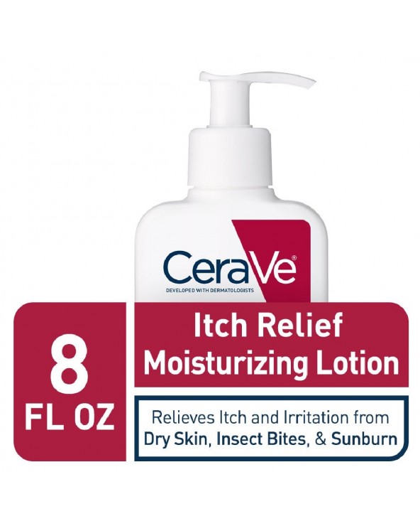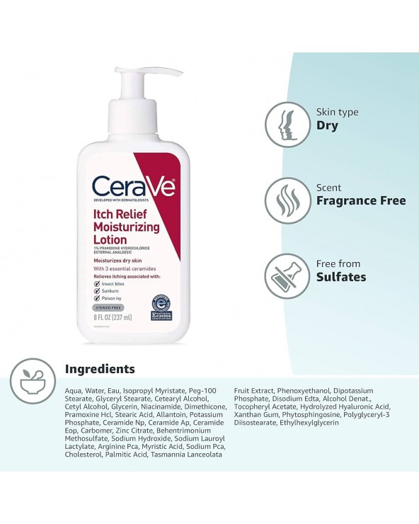 CeraVe Itch Relief Moisturizing Lotion is formulated with 1% pramoxine hydrochloride to provide fast-acting, long-lasting, temporary relief from itching associated with dry skin, insect bites, sunburn and minor skin irritations. Developed with dermatologists, our clinically tested anti-itch lotion has been found to provide relief within two minutes—and last for up to eight hours—and 100% of users experienced relief in clinical studies*. Fragrance-free, our itch relief lotion is fortified with 3 essential ceramides that work together to lock in skins moisture and help restore your skin’s protective barrier. MVE technology encapsulates ceramides to ensure efficient delivery within the skin’s barrier and slow release over time. Supporting your protective skin barrier, long after you’ve finish applying. Suitable for all skin types