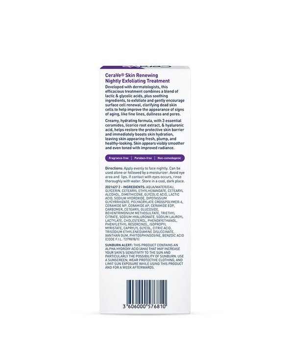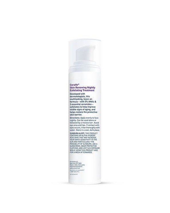 Developed with dermatologists, CeraVe Skin Renewing Nightly Exfoliating Treatment is an AHA serum with a 5% blend of glycolic acid and lactic acid for gentle exfoliation to help smooth fine lines, accelerate skin's surface cell renewal and clear away dead skin cells, without causing flaking or redness. With continued use, skin looks healthier, radiance is improved, and signs of aging such as the appearance of wrinkles, dullness, dark spots and enlarged pores are reduced. Potent, yet gentle and lightweight, this multi-tasking, overnight AHA serum is formulated with 3 essential ceramides that work together to lock in skins moisture and help restore your skin’s protective barrier, hyaluronic acid and licorice root extract to help maintain the protective skin barrier, immediately boost skin hydration and help visibly brighten and even skin tone after 8 weeks of use.* MVE technology encapsulates ceramides to ensure efficient delivery within the skin’s barrier and slow release over time. Supporting your protective skin barrier, long after you’ve finish applying. The creamy, hydrating skin treatment is non-comedogenic, fragrance-free and suitable for all skin types, including sensitive skin.