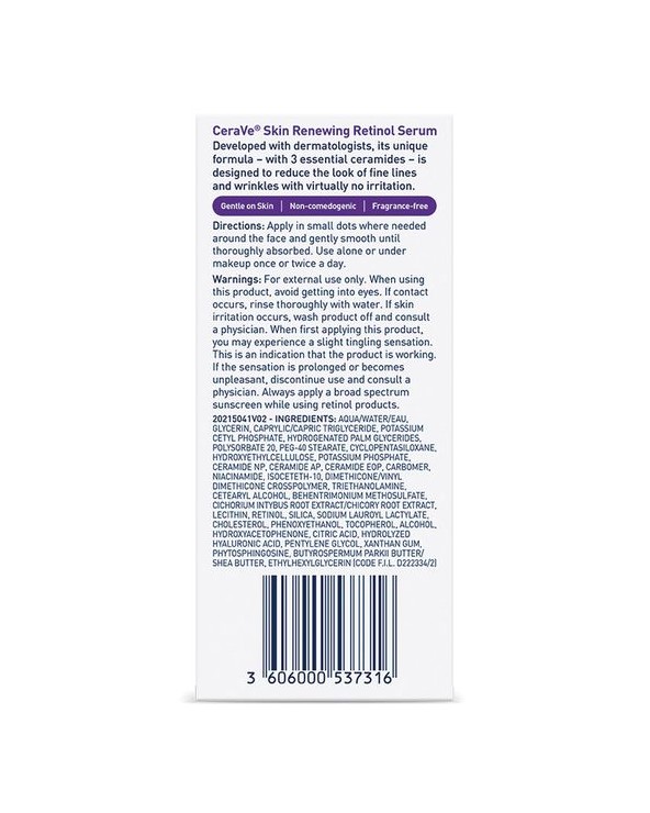 CeraVe Skin Renewing Retinol Serum is a gentle, yet effective daily retinol serum that provides your skin with a variety of anti-aging benefits. Our retinol face serum is formulated with ingredients like hyaluronic acid for extra hydration, niacinamide to soothe, and three essential ceramides that work together to lock in moisture and help restore your skin’s protective barrier. It’s also formulated with MVE Technology that encapsulates ceramides to ensure efficient delivery within your skin’s barrier and slow release over time, supporting your protective skin barrier long after you’ve finished applying.