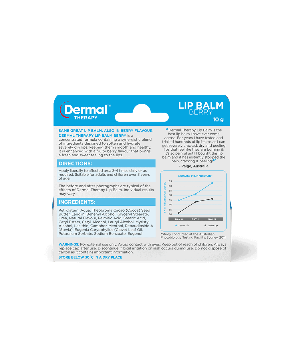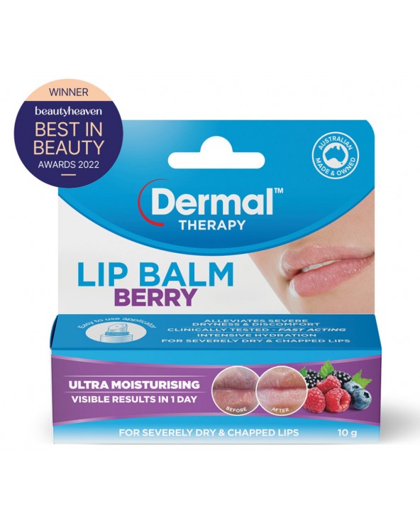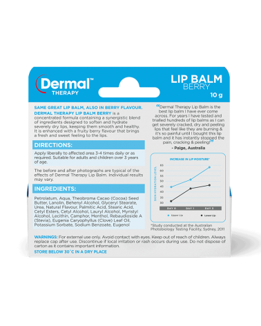 For fresh and smooth feeling lips, try our berry lip balm concentrated formula, paraben free and clinically tested to keep your lips healthy. Dermal Therapy Lip Balm Berry softens and hydrates for the ultimate in lip care.