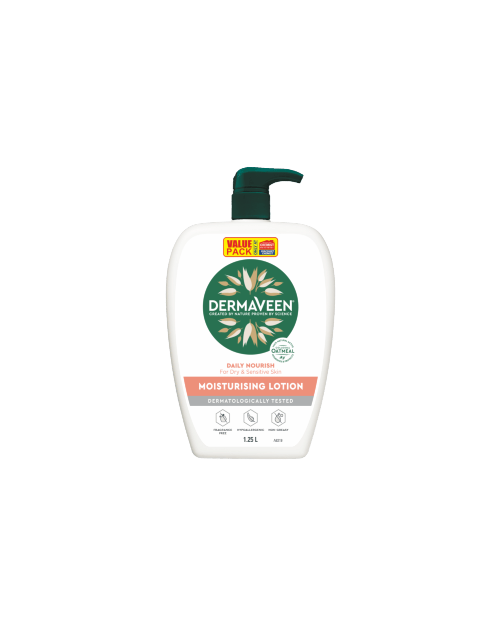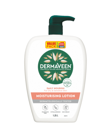 DermaVeen Daily Nourish Moisturising Lotion for normal to sensitive skin is fragrance-free, hypoallergenic, non-greasy and dermatologically tested.