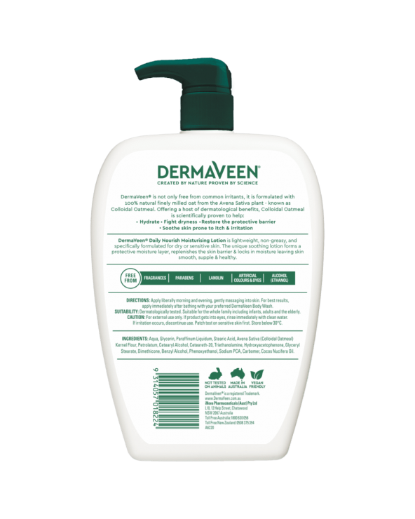 DermaVeen Daily Nourish Moisturising Lotion is lightweight, non-greasy, and specifically formulated for dry and sensitive skin. The unique soothing lotion forms a protective moisture layer, replenishes the skin barrier & locks in moisture leaving skin smooth, supple & healthy.