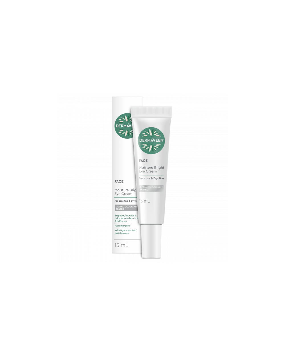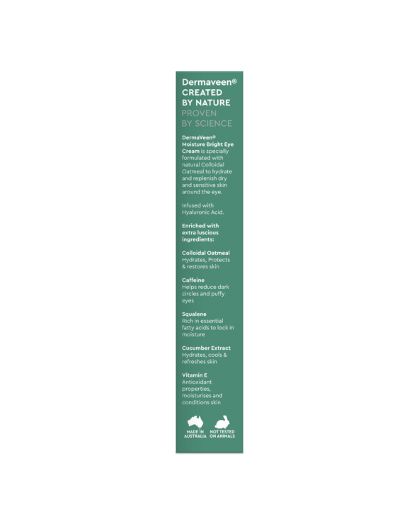 DermaVeen Moisture Bright Eye Cream is specially formulated with natural Colloidal Oatmeal to hydrate and replenish dry and sensitive skin around the eye. Infused with Hyaluronic Acid and Squalene. Hypoallergenic Free from Common Irritants Dermatologically Tested. Not tested on animals. Made in Australia. Vegan Friendly