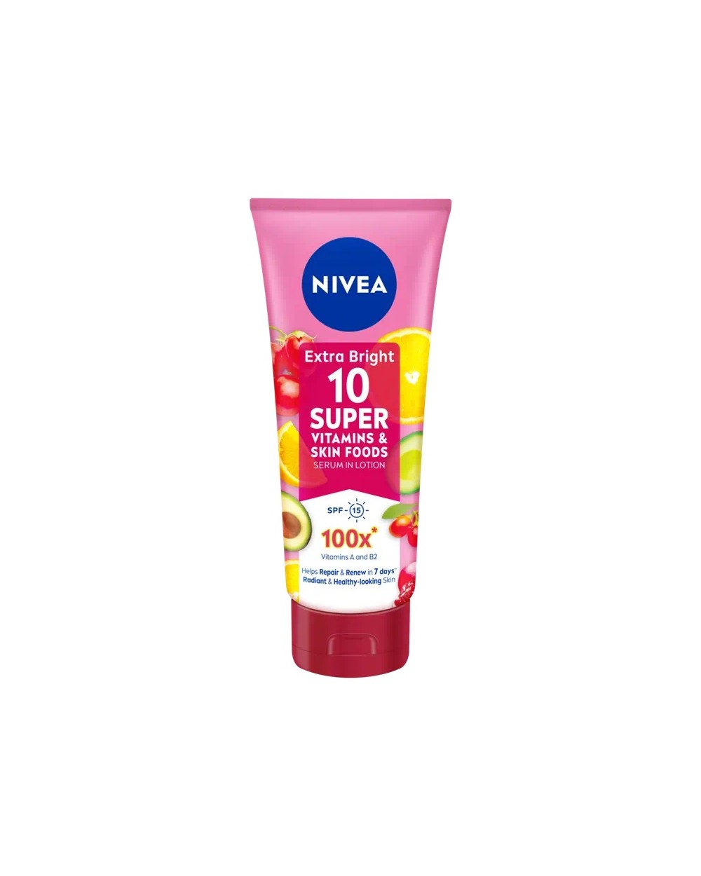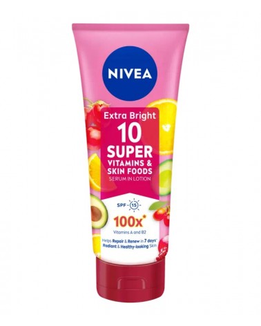 NIVEA Extra Bright 10 Super Vitamins & Skin Foods Serum in Lotion contains 100x Vitamin A to repair skin & Antioxidants to renew skin for radiant, healthy youthful skin in 7 days. Helps repair dullness from sun exposure Formula with Vit. C, A, B4, Pro B5, B9 and E - Brightens skin for radiant complexion Formula with Lemon, Goji Berry, Pomegranate and Avocado - Known to have antioxidants to nourish and smoothen for healthy-looking skin SPF 15 - Protects from sunlight.