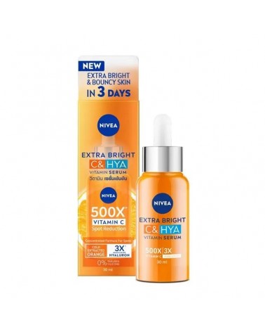 The new NIVEA Extra Bright C&Hya Vitamin Anti-Spot Serum gives you radiant skin thanks to best of nature and science. This fast absorption serum is charged with 500X Vitamin C and 3X PURE HYALURON [HA], which acts on different layers of the skin and activates your skin's own Hyaluron production leaving skin feeling hydrated, soft and bouncy after use. The orange essence undergoes cold extraction process, pulling nutrients from ingredients without high heat to preserve its 500X Vitamin C concentration properties and ensure maximum skin efficacy. The precious ingredient passes several steps in the process to attain the precious pure orange essence and absorbs to skin fast without leaving any stickiness. Smooths up to 91% tired skin areas and reduce up to 91% spots. Experience dewy, healthy glow and bouncy skin in just 3 days. Gentle to skin, perfume free, non-comedogenic, with 0% paraben and 0% silicone. Suitable for sensitive skin and all skin tones & skin types.