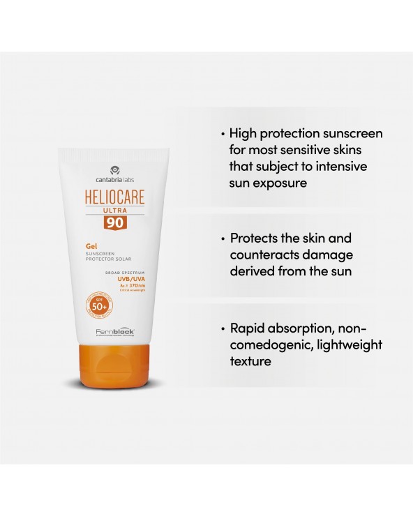 Heliocare Ultra 90 Gel SPF50+ , high protection sunscreen for most sensitive skins that subject to intense sun exposure. Protects the skin and counteracts damage derived from the sun. Formulated with physical and chemical filters, and the exclusive photoprotective technologies to optimize sun protection and prevention of cellular damage.
