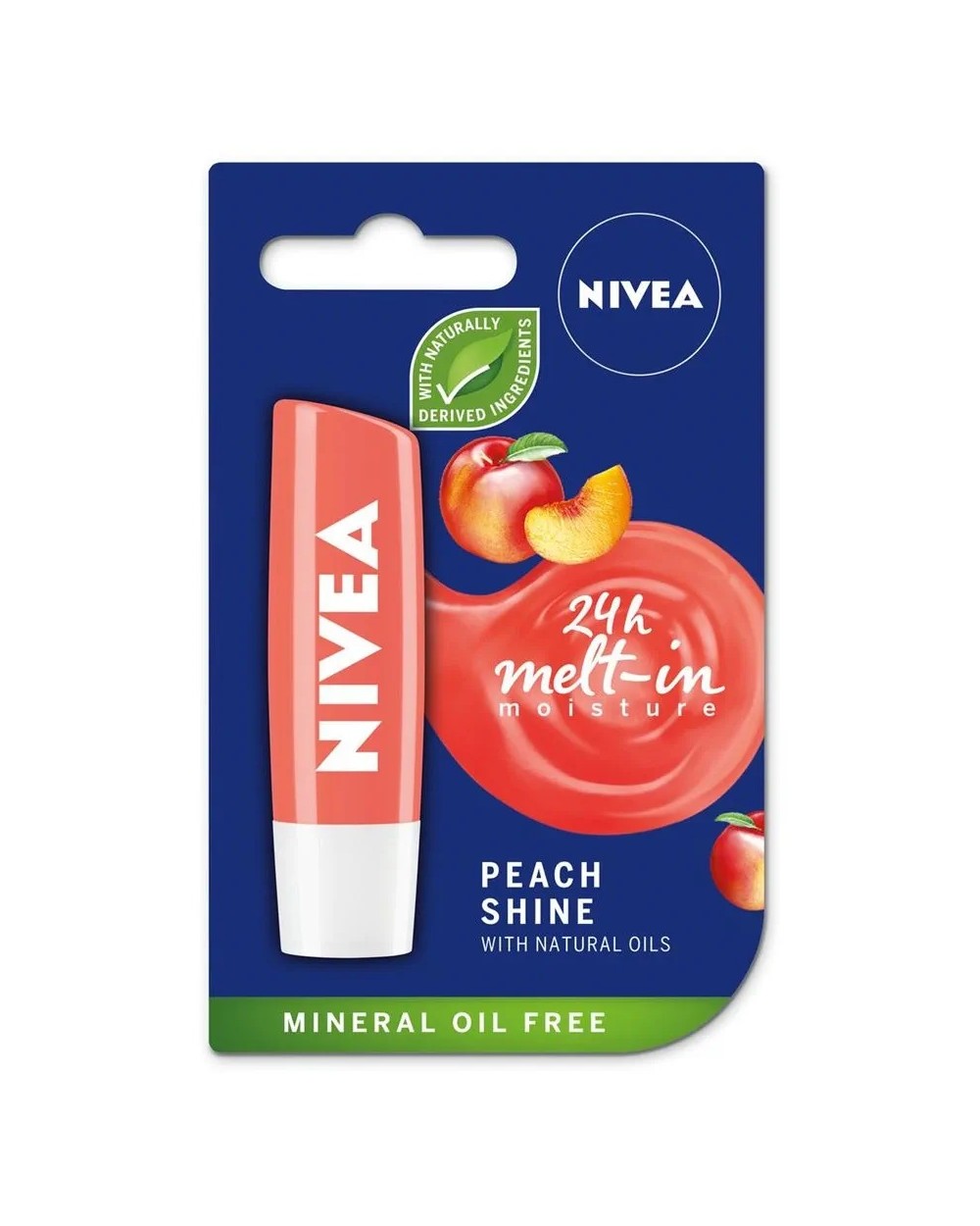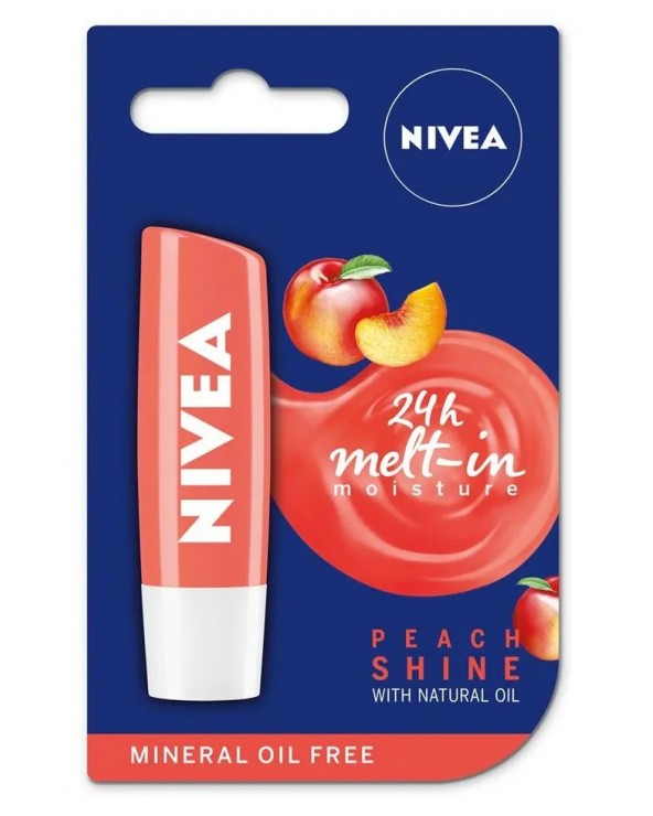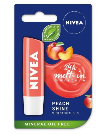 NIVEA Peach Shine Caring Lip Balm provides you with a delicious peach aroma and a subtle coral-pinkish shine. The unique formula enriched with shimmery pigments instantly melts into your lips and keeps them moisturized for 24 hours*. It glides on evenly and easily so that no mirror is required! For a beautiful ouch of shiny color and soft, kissable lips – all day, every day! The skin compatibility of this caring lip balm has been dermatologically approved.*clinically tested
