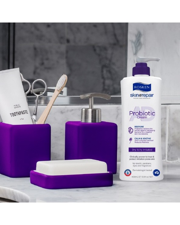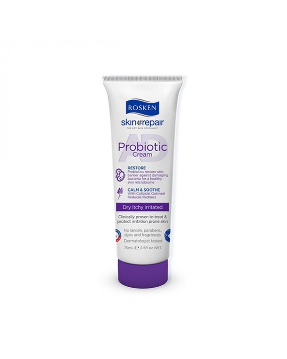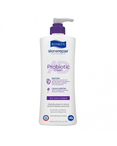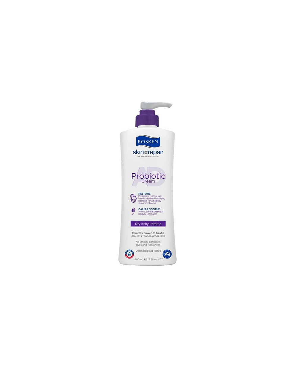 Rosken AD Probiotic Cream uses a unique formula enriched with a special blend of Probiotics (Lactobacillus Bulgaricus and Streptococcus Thermophilus) and Colloidal Oatmeal to restore and relieve very dry, itchy and irritated skin. To keep with good hygiene practises, the AD Cream products are made with pumps (400ml) and squeezable tubes (75ml) to avoid contamination that often occurs with moisturising pots/ jars.