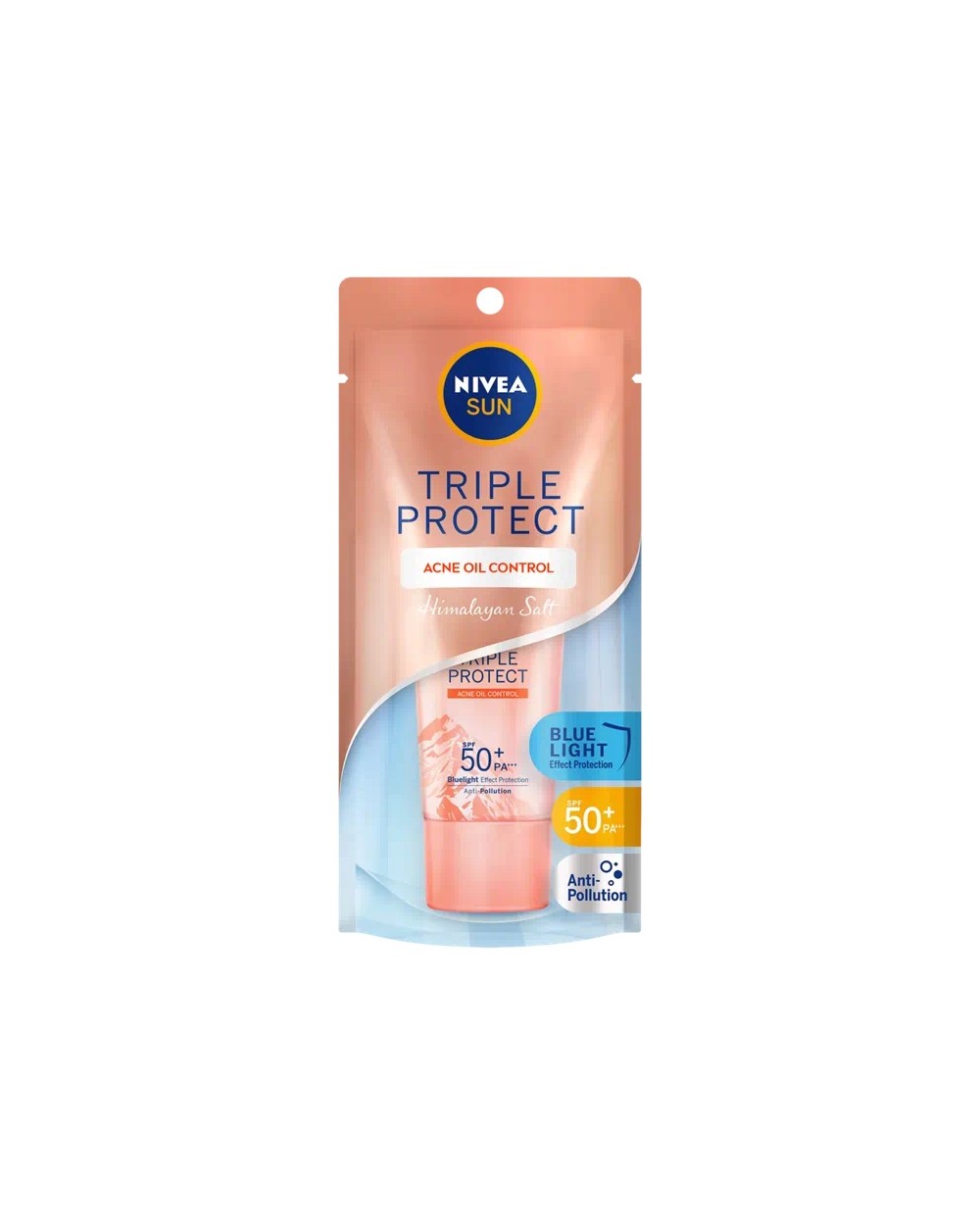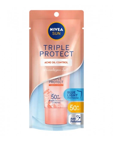 NIVEA Sun Triple Protect Extra Radiance & Smooth SPF50+ PA+++ with ultralight texture formula for quick absorption & comfortable skin feel. The advance technology of triple protection can effectively protect skin against blue light, UVA, UVB and anti-pollution. It is also formulated with Himalayan Salt is non-pore clogging and non acne causing, leaving matt looking skin for 8 hours.