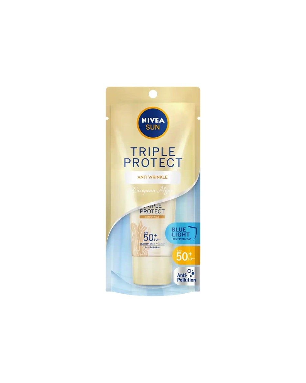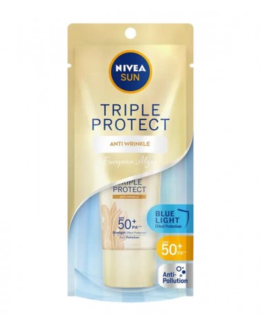 NIVEA Sun Triple Protect Extra Radiance & Smooth SPF50+ PA+++ with ultralight texture formula for quick absorption & comfortable skin feel. The advance technology of triple protection can effectively protect skin against blue light, UVA, UVB and anti-pollution. UV exposure causes wrinkles and signs of aging, special formula with European Algae proven effective to prevent & reduce fine lines even in eye area.